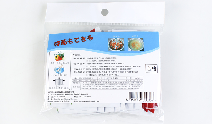 使用方法:約1g本品兌水2L,配制成溶液,將食材及用具放入溶液浸泡5-10分鐘,然后用清水沖洗即可。